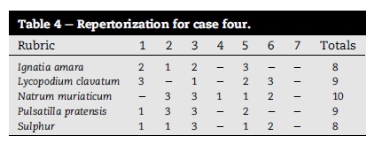 The following rubrics were used in the repertorization for case four (refer to Table 4): Rubrics (Murphy, 1998).