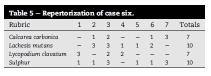 The following rubrics were used in the repertorization for case six (refer to Table 5): Rubrics (Murphy, 1998).