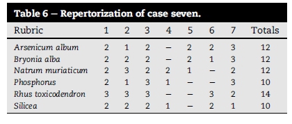 The following rubrics were used in the repertorization for case seven (refer to Table 6): Rubrics (Murphy, 1998).