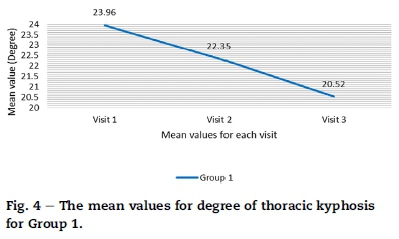 In Fig. 4 at visit one, Group 1 had a mean thoracic kyphosis of 23.96°. At visit four, the mean thoracic kyphosis was 22.35°. At visit seven, the mean thoracic kyphosis was 20.52°. The mean decrease in thoracic kyphosis was 14.33%. As seen from the line graph, there is a linear decrease, indicating that the degree of kyphosis had decreased within this group from visits one to seven.