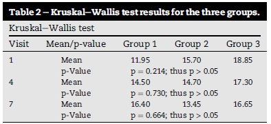 The Kruskal-Wallis test results presented in Table 2 show that the p-value at visit one was not statistically significant (p = 0.21). The baseline reading of p = 0.21 showed that the groups started off comparable. However, the p-value remained greater than 0.05 at visit four (p = 0.73) and visit seven (p = 0.66). Therefore, there was no statistical difference (p > 0.05) noted between the three groups at each of the three visits. As there were no significant statistical differences present within the Kruskal-Wallis test inter-group results, the Mann-Whitney U test was not performed.