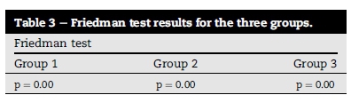The results presented in Table 3 were statistically significant (p ≤ 0.05) in all three groups. Group 1 had a p-value of 0.00, Group 2 had a p-value of 0.00 and Group 3 had a p-value of 0.00. The Wilcoxon Signed Ranks test was used for within group analysis to demonstrate where these changes occurred.