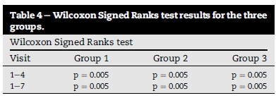 From the results presented in Table 4, the test revealed that there was a significant statistical improvement in all three groups (p ≤ 0.05) from visits one to four, as well as from visits one to seven.