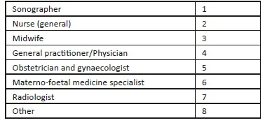A quantitative descriptive cross-sectional survey was conducted at two national congresses hosted by the South African Society of Ultrasound in Obstetrics and Gynaecology (SASUOG) and the South African Society of Obstetricians and Gynaecologists (SASOG). Both professional organisations represent the target population of sonographers, midwives, general practitioners (GPs), obstetricians and maternal-foetal medicine specialists who practise obstetric ultrasound in the public and private health sectors.