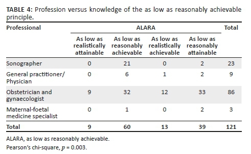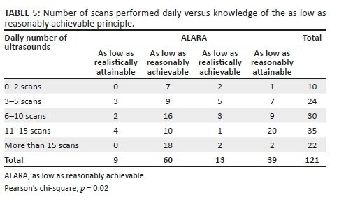 Although traditionally used in terms of ionising radiation, the application of the ALARA principle is now widely advocated in the prudent use of obstetric ultrasound (Miller 2008:159). It was disappointing that only half of therespondents in our study knew the correct meaning of the acronym. A significant statistical difference was noted (p = 0.03) between professional categories, with 91% of sonographers demonstrating familiarity with the term (Table 5). This can most likely be attributed to their knowledge gained from diagnostic radiography where the concept is pivotal in radiation safety. Furthermore, there was a positive association between the number of scans performed by end users and the correct identification of the term ALARA (p = 0.02) (Table 6).