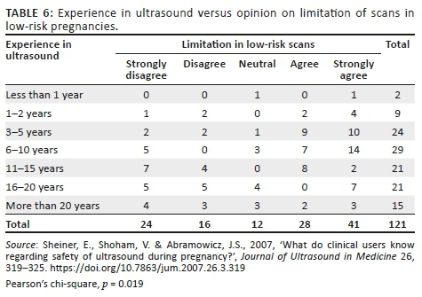 Financial gain and parental expectations have been identified as some of the motivating factors behind frequent ultrasound scans (Helliker 2015). In our study, only 18% of the respondents advocated for more than three scans in a low-risk pregnancy. Similarly, the majority of Americans deemed a mean of 2.6 scans to be ideal in a low-risk pregnancy (Sheiner et al. 2007:322). Similar results were noted between the two study populations on the issue of limiting the frequency of ultrasound scans, with 57% South Africans agreeing and strongly agreeing with the limitation in the number of scans in a low-risk pregnancy and 50% of the Americans who expressed the same view. A statistically significant association (p = 0.019) was found between the years of experience and the number of routine scans deemed suitable during pregnancy (Table 6), with more experienced South African professionals being more cautious with the use of ultrasound.