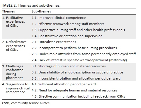 Clinical competence of CSNs could be improved through effective collaboration among all stakeholders, including the hospital management, professional nurses, CSNs and the SANC. From this study, despite the positive and facilitative experiences, CSNs had defacilitative experiences and challenges that have a negative impact on their development and improvement of clinical competence. Many of the challenges reported by participants are consistent with those reported in the literature. There are various programmes or strategies in place to ensure that the new graduate nurses enter the working environment well prepared and emerge as competent practitioners. However, this study indicates that most of the challenges raised are the result of a shortage of human and material resources that impedes the effectiveness of community service. Suggestions were made in the hope that they would be considered to improve the clinical competence of CSNs. The results of this qualitative study contribute to the body of knowledge regarding clinical competence of CSNs during their placement.