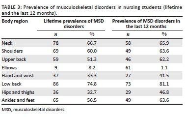 There is a high prevalence of MSDs (83%) in undergraduate nursing students at the University of Johannesburg, South Africa. These findings are substantially higher when compared to other prevalence studies on students and health professions from other disciplines. Lower back disorders presented with the highest prevalence rate in the last 12 months, and over the participants' lifetime. There are also numerous factors that play a role in the prevalence of these MSDs. Given the high rates of WRMSDs in qualified nurses, it is our recommendation that students should be introduced to educational interventions to prevent and manage work-related MSDs, to prevent a contagion effect.