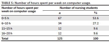 Table 5 indicates that most of the students (53.6%, n = 67) spent about 0-5 h per week using a computer. Twenty-seven per cent (n = 34) of the sample spent 6-10 h on computer usage per week. Time spent at the computer did not yield any statistically significant results.