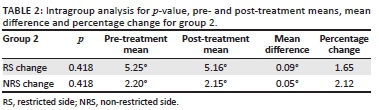 The bar graph (Figure 1) shows that the mean value for group 1 on the RS pre-treatment was 4.93° and post-treatment was 2.68°. There was a mean change of 2.25° on the RS. The non-restricted side (NRS) pre-treatment mean was 3.53° and post-treatment mean was 2.87°, showing a change of 0.66° on the NRS. The angle of the innominate bone showed a mean change of 45.6% on the RS and the 18.7% on the NRS between pre- and post-treatment readings. The change in angle was deemed statistically significant on the RS (p ≤ 0.001). All the above-mentioned intragroup analysis can be seen in Table 1.