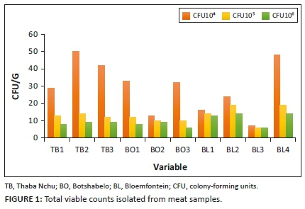 METHODS: The study was conducted in Mangaung Metropolitan Municipality during the winter season. Samples were collected through convenience sampling from the representative towns Thaba Nchu, Botshabelo and Bloemfontein. Using swabs, surface samples were collected and quantified from selective media. Eight beef samples were also collected; the microbial load on each sample was quantified and identified using a RapID kit