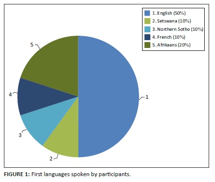 The home languages spoken by participants who listed English as an additional language included Afrikaans (two), French (one), Northern Sotho (one) and Setswana (one) (Figure 1).