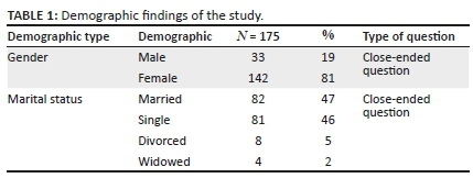 The demographic information (see Table 1) includes the gender of respondents and their marital status. From the 175 respondents who took part in the study, 33 (19%) were males and 142 (81%) were females. A total of 82 (47%) respondents were married, 81 (46%) were single, eight (5%) were divorced whilst four (2%) were widowed.