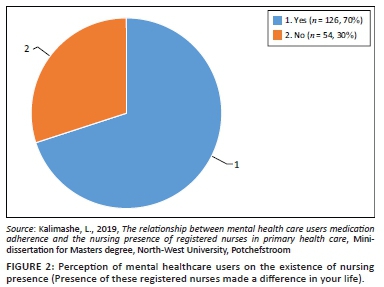 However, at the time of the study, there was no evidence on how the nursing presence of RNs relates to MHCUs' medication adherence at PHC level. A literature search confirmed this knowledge gap. The literature search included searches of the databases in the North-West University's library to gather information regarding nursing presence, medication adherence and mental healthcare services at PHCs. The search engines and databases included the following: Elton B. Stephens Company Host (EBSCOHost), ScienceDirect and Google Scholar Search. In light of the need for such research - so that appropriate interventions can be recommended and developed in future - the researchers conducted research to determine the level of MHCUs' medication adherence, the nursing presence of RNs and to explain the relationship between these two variables. In this research, the researchers acknowledged that the level of medication adherence is self-reported by MHCUs and should be interpreted as such.