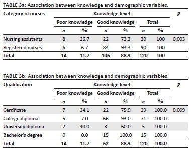 Overall, the results showed that the nurses had good knowledge about maternal nutrition with a mean (M) knowledge score of 10.14 out of a possible 15, with an SD of 1.9. The results show that most of the questions that assessed the knowledge regarding maternal nutrition were answered correctly. For instance, out of 120 nurses, 99.2% (n = 119) gave a correct answer to the statement, 'To avoid constipation, the pregnant woman should increase her intake of whole-grain, vegetables and fruits'. Only four questions regarding maternal nutrition knowledge were answered incorrectly. The nurses showed poor knowledge on the recommended time for storage of iron and calcium 23.3% (n = 28), recommended daily energy intake during the last two trimesters of pregnancy 45% (n = 54), optional weight gain during pregnancy 24.2% (n = 29) and cause of physiological anaemia during pregnancy 17.5% (n = 21). Table 2 displays the results.