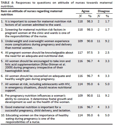 Ten items on a four-point Likert scale, which ranged from 'strongly agree' to 'strongly disagree', measured the nurses' attitudes towards maternal nutrition. Because of low response rates for certain questions, and to make a meaningful interpretation, the scale was reduced to only two options, with the options of 'strongly agree' and 'agree' combined, and 'strongly disagree' and 'disagree' being combined. The 'agree' responses were regarded as positive attitude, and 'disagree' responses as negative attitude towards maternal nutrition. Table 4 presents the results on attitudes.