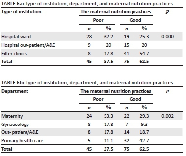 A cross tabulation of the respondents' institution type and practice showed that those from the filter clinics have good practices compared to those from hospital wards and Accident and Emergency Department (A&E); the majority (54.7%: n = 41), having good practice, and only 17.8% (n = 8) having poor nutrition practices. The Pearson Chi-square shows a significant association; Chi-square = 19.144, df = 2, and p = 0.000. There was a significant association found regarding practices with institution where practice took place, with p-value 0.000, and department at p-value 0.002. Pearson Chi-square shows a significant association; Pearson value = 14.926, df = 3, p = 0.002. Table 6 presents the results.