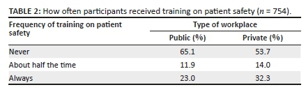 In this regard, participants were asked to indicate how often they received training to ensure patient safety during pre-hospital emergency care. The results show that the majority of the participants working in either the private (53.7%) or public (65.1%) sector has never received training on patient safety (χ2 = 14.1; Cramer's V = 0.14; p < 0.007) (Table 2).