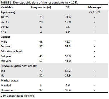 Of the 130 invitations sent, only 105 completed questionnaires were returned, giving a completion rate of 80.8%. A low response rate was attributed to that some senior students were repeating NCH II and NGN II, while some did not respond to the reminders sent to them. With the mean age was 25 ± 0.71, the majority of the respondents, 71.4% (n = 75), fell into the 18-25 age group, 19% (n = 20) into the 26-33 age group, while 7.6% (n = 8) fell into the 34-41 age group and 1.9% (n = 2) were aged 42 years and above. In terms of gender, the majority of the respondents, 54.3% (n = 57), were female compared with 45.7% (n = 48) male. More than half, 59% (n = 62), of the respondents were in their fourth year of study, while third years comprised just 41% (n = 43). In terms of marital status, majority 92.4% (n = 97) were unmarried, while only a hand full number 7.6% (n = 8) were married. More than two-third, 68.2% (n = 73) of the respondent in this study had experienced GBV in the past, while 29.9% (n = 32) had not experienced GBV in the past (Table 1).
