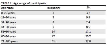 A total of 82 participants were interviewed in the study, 42 male participants and 40 female participants, indicating an even gender distribution, as shown in Table 1. Sixty-two participants (76%) were over 50 years of age, as shown in Table 2. A staggering 59% of the participants were the elderly, above 60 years of age.