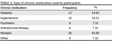 About 43% of the participants were found to be on multiple medications. These medications include diabetes medication, psychiatric medication, antiretrovirals (ARVs) and hypertensive medication, which was the most common (Table 3). About 7.32% of patients were on other medications (asthma medication or rheumatoid arthritis).