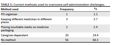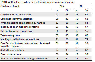 Self-administration of medicines presents many challenges. Twenty-six per cent of the participants alluded to being unable to self-administer. This is usually the case with participants with total blindness but also depends on the severity of the condition in those with partial blindness. A total of 27% of the participants could not open the medication containers, 27% spilled medicines and 62% felt the incorrect amount was dispensed from the medicine container. A further 67% of the participants could open medication containers, especially solid dosage forms. Participants further explained that liquid medicines and bulk containers were more challenging. Participants have to accurately measure liquid medicines and administer the dosage without spillage.