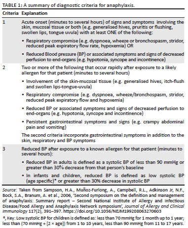 There are essentially three criteria for anaphylaxis. The diagnostic criteria, which include the full spectrum of signs and symptoms of anaphylaxis, are summarised in Table 1 (Sampson et al. 2006).