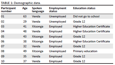 The University of Venda Ethics Committee approved the study (project number SHS/16/PDC/17/0408). Authorisation to conduct the research was acquired from the chief of the selected village. Participants were asked to give their informed written consent. The researcher explained the study and process to participants in a private room. They gave voluntary consent before being interviewed, and they could withdraw without any penalty, and their data would be destroyed. Only the researcher, supervisor and independent coder had access to the data. Participants were informed that information would be made available in a report without exposing their names. They were informed that counselling services were available and pre-arranged after the interviews at no cost should they need them; however, the use of the counselling services was not needed. All data were kept on a computer on the cloud, password-protected, and will be deleted 5 years after the report is published. No transcripts will reveal their names, and participants will be numbered.