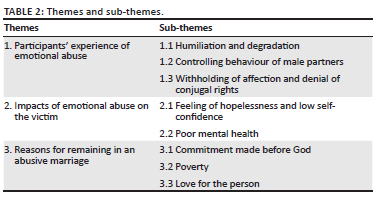 Three themes and eight sub-themes emerged from the data analysis, as shown in Table 2. The themes and sub-themes identified followed the participants' accounts to support their experiences of emotional abuse and its impact; the appropriate quotes drawn from the data collected are contextualised with the relevant literature to substantiate the themes and sub-themes below.