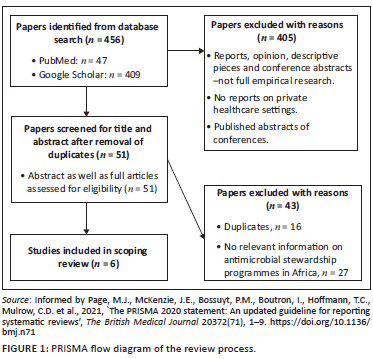 The scoping review was informed by Arksey and O'Malley (2005:3-15). Briefly, this approach allows for objective, systematic and inclusive identification and screening of relevant literature. Data were searched from Google Scholar and PubMed databases on 25 June 2022. The keywords that were entered into the search engine, either on their own or in combination to create Boolean phrases, were implementation, antimicrobial, stewardship, antibiotics, private, healthcare and Africa.