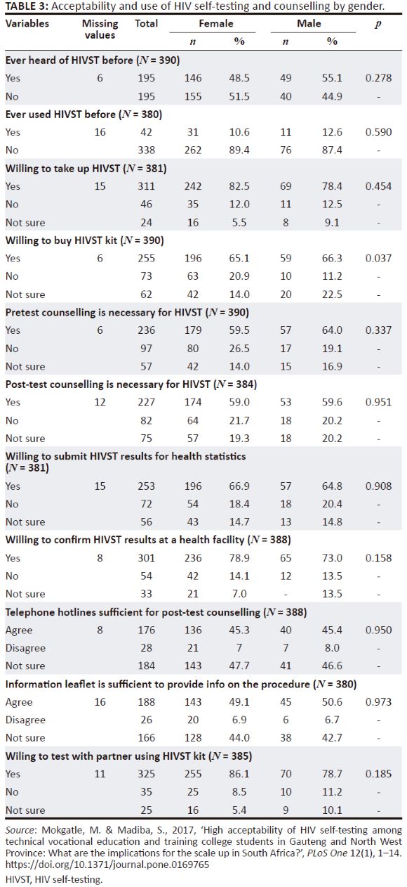 The South African government has made HIV testing efforts to mobilise young people to access youth-friendly HIV testing services (Ramirez-Avilla et al. 2012). Despite these efforts, under-served key populations such as youth still do not have adequate access to HIV testing services (Makusha et al. 2015). However, a number of studies conducted among college and university students regarding HIVST have shown similar results in relation to HIVST. A study conducted in South Africa among student nurses in a private nursing college showed that most participants found HIVST to be acceptable (Madiba, Segobola & Mokgatle 2015). Similarly, a college study in Gauteng and North West provinces, South Africa, found that the acceptability of HIVST was high (81.7%), with three-quarters of students showing willingness to purchase a self-test kit. The acceptability of HIVST in the study was associated with being sexually active and having multiple sexual partners (Mokgatle & Madiba 2017). In a university in the DRC, the acceptability of HIVST by students was also found to be high (81.4%). Contrary to the study in Gauteng and North West provinces, South Africa, factors associated with HIVST uptake were knowledge of the importance of the test, perceptions of pre- and post-test counselling and the willingness to test with a partner.