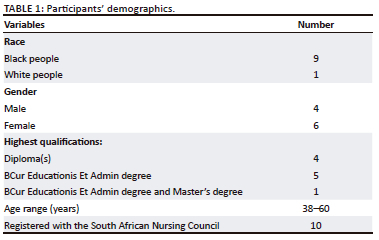 Three themes and a number of subthemes surfaced in this study. The themes were: (1) negative perceptions of primary healthcare nurse managers on workplace relationships, (2) positive perceptions of primary healthcare nurse managers on workplace relationships and (3) building workplace relationships between primary healthcare nurse managers and union leaders. The summary of the participants' demographics is provided in Table 1. Ten participants interviewed consisted of nine black people and one white person, four males and six females. Four of the participants have Diplomas in Nursing, Midwifery and Nursing Management, while five of them have a BCur Educationis Et Admin degree and one has a BCur Educationis Et Admin degree and a Master's degree. Their age ranged between 38 and 60 years and were all registered with the South African Nursing Council as nurse administrators.