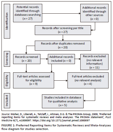 Moher, D., Liberati, A., Tetzlaff, J., Altman, D.G. & The PRISMA Group, 2009, 'Preferred reporting items for systematic reviews and meta analyses: The PRISMA statement', PLoS Medicine 6(7), e1000097. https://doi.org/10.1371/journal.pmed.1000097        [ Links ]