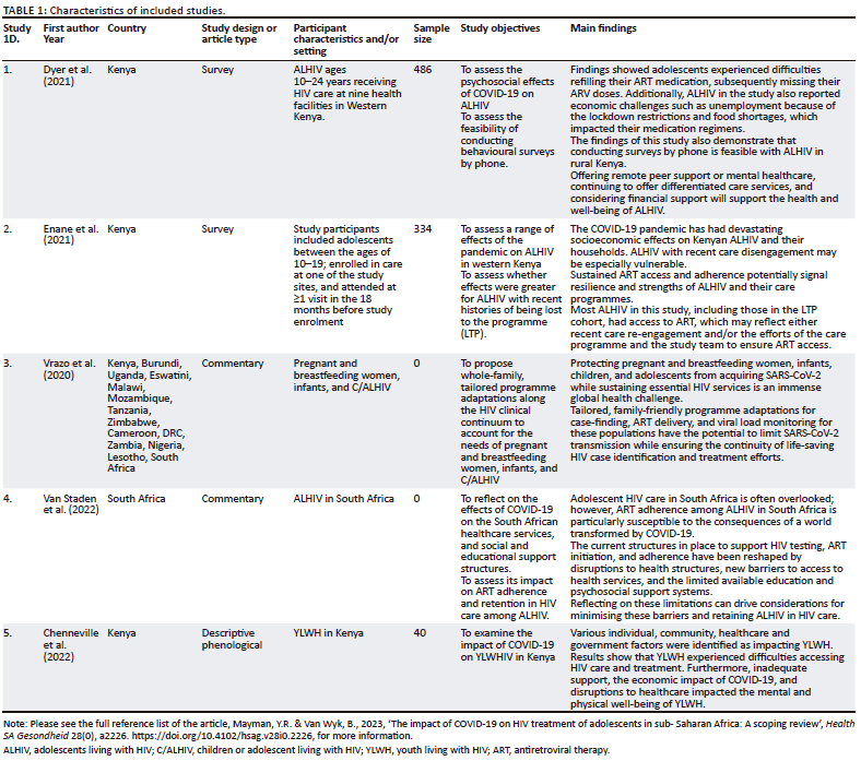The social impacts of the pandemic were highlighted in three of the included articles. Enane et al. (2021:20) found that 'being out of school, missing socialization with peers, lacking money for food or basic needs, and a lack of work for themselves or their families' were the major life challenges adolescents experienced during the pandemic. Additionally, the commentary by Van Staden et al. (2022:3) found that 'evidence-based support structures were less accessible to adolescents during the most restricted lockdown periods'. Similarly, findings by studies conducted in Kenya by Dyer et al. (2021) and Chenneville et al. (2022) found that adolescents and youth living with HIV and/or AIDS experienced social isolation, fear, and relationship issues because of curfew restrictions.