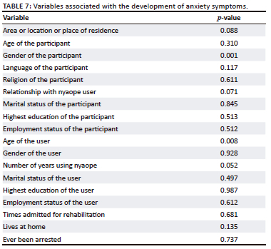 Some variables, although not statistically significant, were strongly associated with the development of anxiety symptoms, and these include the place of residence, which is supported by previous reports that nyaope use is rife in specific areas, which typically are of low socioeconomic status, have high unemployment rates and lack recreational facilities (Masombuka & Qalinge 2020; Mokwena & Morojele 2014). The relationship of the participant with the nyaope user was also strongly associated with the development of anxiety symptoms, which can be explained by the majority of women participants in this study.