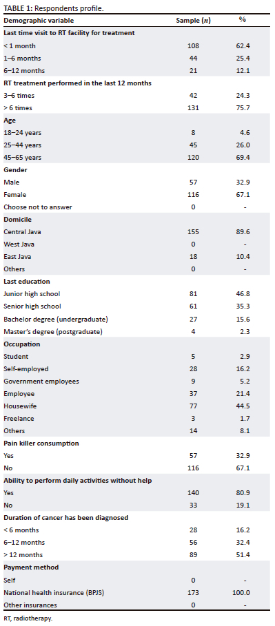 In the chosen RT facility, 216 total responses were recorded. After applying inclusion criteria, there remained 173 valid responses from patients who received RT treatment more than three times and whose most recent treatment was within the previous year, as described in Table 1. Most respondents (75.7%) received RT treatment more than six times and visited the facility for less than a month (62.4%). Most patients are female (67.1%) and between the ages of 45 years and 65 years make up the majority (69.5%) of the patient population. About 89.6% of the patient's origins are in Central Java. Most respondents (46.2%) had junior high school as their most recent educational level, and 44.5% were housewives. The patient could generally complete daily tasks without assistance (80.9%) and took no painkillers in their treatment (67.1%). Most responders are independent and can care for themselves, and survey participants can converse and respond to the questions. All patients (100%) had their payment method covered by national health insurance Badan Penyelenggara Jaminan Social (BPJS), and for the majority of patients (51.4%), the cancer diagnosis has been recognised for longer than a year.