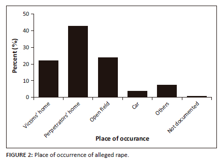 The findings in this study reveal that more than half the cases also involved threats of violence. Some of the victims reported being physically, bodily assaulted and abducted by the alleged perpetrators. This suggests high rates of violence in sexual assault scenarios, which highlights the need for comprehensive improvements to social policy and hospital emergency and clinical forensic services, as the proper, unambiguous description and interpretation of injuries to areas other than the genitals might be crucial and important in corroborating a victim's account of events (Crane 2013). The majority of the incidents of alleged rape reported by victims in this study took place at the homes of the perpetrators of the rape (42.7%), in open fields in the community (23.8%) or at the victim's home (22.0%). This is similar to findings by Swart et al., who report that a significant number of rape incidents occur at a perpetrator's home, in an open field and at the victim's home (Swart et al. 2000). While open spaces in urban areas are critically important for ensuring the continued presence of nature and related natural resources in built environments, these areas are often regarded as crime hotspots and refuge areas for potential criminals (Perry, Moodley & Bob 2008). It has been reported that the greatest proportion of gang rapes in South Africa occur in public spaces, such as open spaces and parks, stretches of veld and parking areas (Vetten & Haffejee 2005). This suggests that there is a need to introduce innovative safety measures to secure women's freedom of movement. Increasing security and lighting in parks at night and over weekends; carrying out targeted police patrolling, particularly at night and over weekends, in areas surrounding public spaces; and the installation of CCTV cameras in parking areas and parks have been suggested as innovative measures that can help curb rape in open spaces (Vetten & Haffejee 2005). All the rape survivors in this study were brought to the hospital by a member of the SAPS Family Violence, Child Protection and Sexual Offences (FCS) unit. Members of the FCS unit ensure that survivors are treated with the utmost care to avoid secondary victimisation and to investigate the cases (Geldenhuys 2019). Their services have assisted in the successful prosecution of perpetrators of sexual offences (South African Police Service 2021). It has been reported that medico-legal assessment, including the physical examination and evidence collection in a rape case, should never be delayed (Kotzé & Brits 2017). Freedman (2020) reports that a forensic examination must take place within 7 days of the sexual assault (Freedman 2020). Delayed presentation may unfavourably impact medical treatment and affect the quality of evidence and case outcomes, since the probability of recovering foreign DNA diminishes with loss of foreign body fluid (Klemmer, Neill & Jarvis 2021). The findings in this study reveal that a minority (4.9%) of the victims presented ≥ 7 days after the assault. In these cases, finding credible forensic evidence might be unlikely, and it may be difficult to successfully prosecute the alleged perpetrators. In addition, these women are unlikely to have received the appropriate medical care, thus increasing their risk of contracting debilitating illnesses, such as sexually transmitted infections and HIV. Factors such as internal psychological barriers (e.g. shame, anxiety and fear) or environmental factors (e.g. prior relationship with perpetrator) have been reported as barriers to early reporting of rape (Jones et al. 2009). It is, therefore, plausible that women who report late were affected by such psychological and environmental factors. All victims of rape in this study were seen by doctors trained in clinical forensic medicine and working in the RMSH forensic unit. It is paramount that rape victims be seen by healthcare practitioners trained in forensics, to ensure proper medico-legal documentation of evidence and to ensure that the chain of custody is preserved and admissible in a court of law (Pitre & Lingam 2013).
