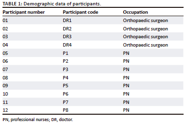 After getting approval to conduct the study, the researcher approached the head of the orthopaedic department for surgeons (DR) and the operational manager for theatre professional nurses (PN) to arrange access to participants and give relevant advice on the best candidates based on inclusion criteria. After access was granted by the orthopaedic head of department and operational manager, the participants were approached. Thereafter, a list of those interested was drafted, with their contact numbers and the date they are available to participate. Consensus was reached on the date and time of data collection. All the participants were on duty on the day of data collection.