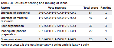 Data were collected in the orthopaedic lecture room within the selected public hospital, which offered a conducive environment for the discussion away from the OTRs activities. The researcher explained about the consent to be signed. It was also explained to them that they are not forced or obligated to take part in the study, and that the whole process will be audio recorded, which the participants responded by saying yes and some nodded in agreement to participate in the study and signed written consent. Participants who were DR and PN were given white cards to write down their generated ideas from the question, while the research assistant wrote responses on the whiteboard. Research assistant was sought to facilitate the NGT process as the researcher is known to the participants. The NGT lasted about 90 min and was in line with the stages of NGT as described by McMillan, King and Tully (2016:657) and the stages are outlined in Table 2 below. The following stages were followed: Data analysis ran concurrently with data collection using the seven stages of (McMillan et al. 2016): (1) The silent generation of ideas in writing; (2) round-robin recording of ideas; (3) serial discussion; (4) preliminary vote; (5) discussion of preliminary vote; (6) final vote on priorities and (7) listing and agreement on prioritised ideas.