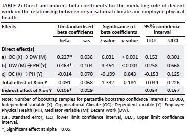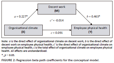 RESULTS: No significant direct effect existed to show that the sounder an organisational climate, the better the physical health of employees will be (β = -0.014, t = -0.199, p = 0.843, 95% confidence interval [CI] [-0.153 to 0.125]). However, statistically significant evidence existed to show that the more focus on promoting decent work, the better the physical health of employees will be (β = 0.463, p = < 0.001, 95% CI [0.258 to 0.668]). Finally, decent work has a full mediating effect on the relationship between organisational climate and employee physical health (β = 0.105, 95% CI [0.054 to 0.167