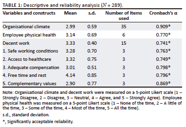 Based on the results for the internal consistency (see Table 1), Cronbach's alpha values for the instruments show acceptable reliability coefficients. Thus, organisational climate had an overall Cronbach's alpha coefficient of 0.909, employee physical health reported a Cronbach's alpha coefficient of 0.770, and decent work reported a Cronbach's alpha coefficient of 0.741. The reported Cronbach's alpha coefficients for the different dimensions of decent work (all Cronbach's alpha values > 0.70) are also considered acceptable. Table 1 also shows the descriptive statistics of the established theoretical variables and constructs. Measured on 5-point Likert scales, all variables and constructs reported moderate mean levels with free time and rest (Mean = 4.14; standard deviation [s.d.] = 0.85) having a moderately high mean rating among the public service employees.