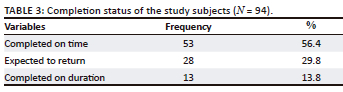 Table 3 illustrates the level of completion achieved by the study participants. A total of 56.4% of the subjects successfully finished the programme within the designated timeframe, while 29.8% were expected to return. Only 13.8% managed to complete the programme within the expected duration.