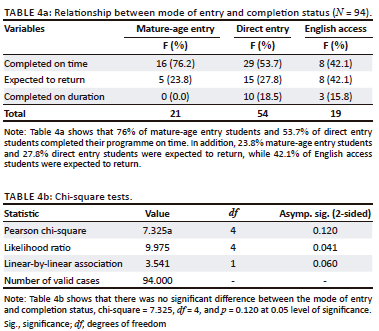 RESULTS: Results show that 76.2% (f = 16) of mature-age entry students and 53.7% (f = 29) of direct entry students completed their programme on time. However, 42.1% (f = 8) of access students were expected to return. Female students 56.8% (f = 25) and male students 56.0% (f = 28) completed on time. There was no significant relationship between the mode of entry and completion status with p > 0.05, respectively