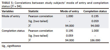 To determine the correlation between the mode of entry and the completion status, the Pearson correlation was used, and the results are shown in Table 5.
