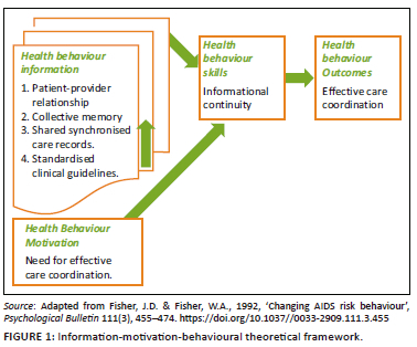 In this article, the authors only applied the health behaviour information construct of the IMB model. According to the IMB model, health behaviour information is defined as the initial requirement for specific health-related behaviour (Fisher et al. 2003:37). The health behaviour information is described in this article as all the information concerning the pregnant women and their condition during the intrapartum period. This information was possible because of the informational continuity approaches, as outlined in Figure 1.
