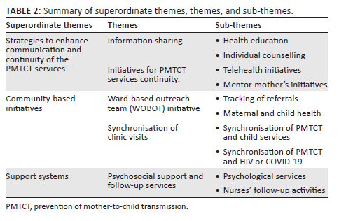 RESULTS: Three superordinate themes emerged: strategies utilised for providing care, community-based initiatives, and support systems to enhance the PMTCT service access.