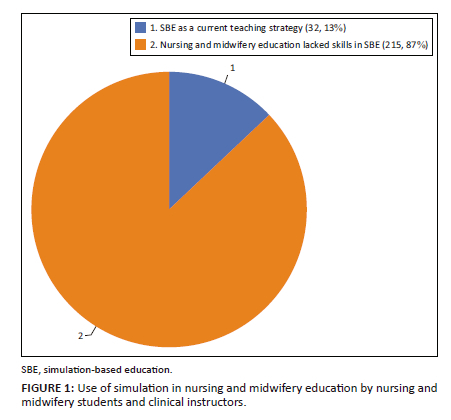 The qualitative information presented earlier is also reflected in the collected quantitative survey data. For example, Figure 1 shows that 247 (83.4%) participants reported that they had some knowledge of SBE in nursing and midwifery. However, only 32 (13%) mentioned SBE as a current teaching strategy in training and clinical institutions, and most lacked SBE skills. They reported a lack of hands-on experience in using SBE in clinical teaching.
