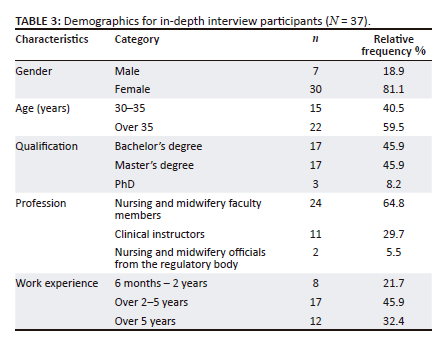 Nursing and midwifery faculty members, clinical instructors, and nursing and midwifery officials from the regulatory body participated in in-depth interviews. They were aged 30 years and above and had more than 6 months of work experience. These participants held bachelor's (n = 17), master's (n = 17) and PhD (n = 3) degrees, and all were Malawians. Refer to Table 3 for detailed demographics of the in-depth interview of participants.
