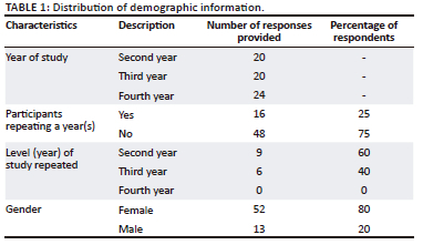 Most participants were fourth-year students (n = 24), followed by the second- and third-year groups with 20 participants (n = 20). Twenty-five percent of participants indicated that they repeated either their second or third year. Most participants were females (80%), and the participants' ages ranged from 19 to 28 years, with the average age being between 20 and 24 years.