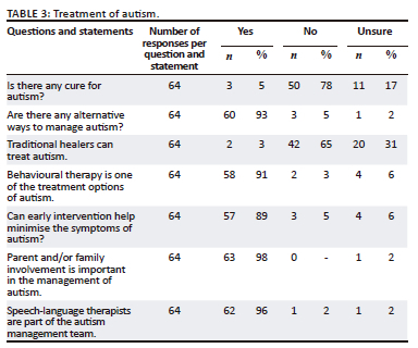 The quantitative data on participants' knowledge aimed at the different treatment options available for autism, regarding whether autism was curable, the effectiveness of early intervention, and the team members that should be involved in treating individuals with autism, are presented in Table 3.